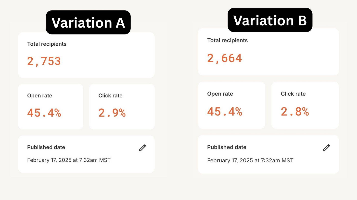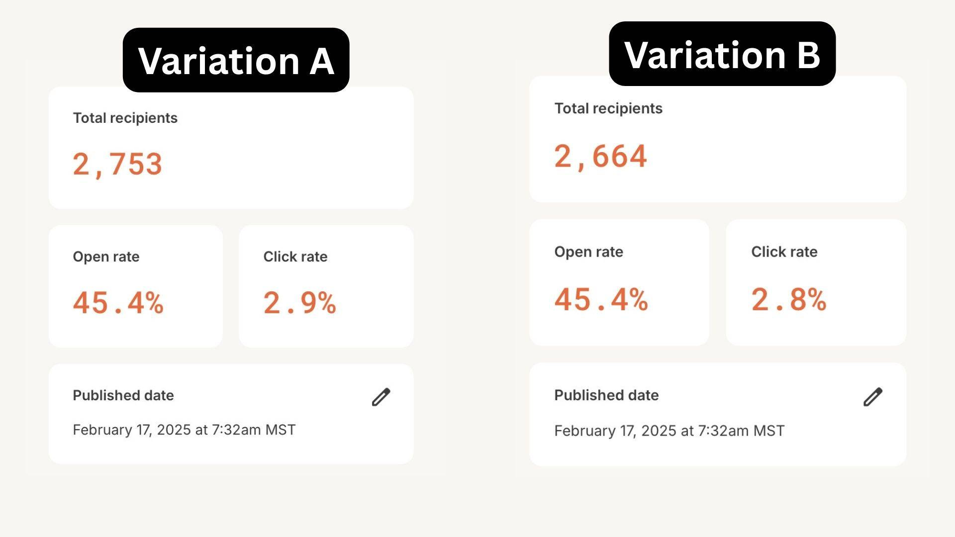 Now, in case you’re curious, here’re the stats of the email I sent (for context, though, I ran an AB test in this email, which is why there’s 2 “sends” in the image below):