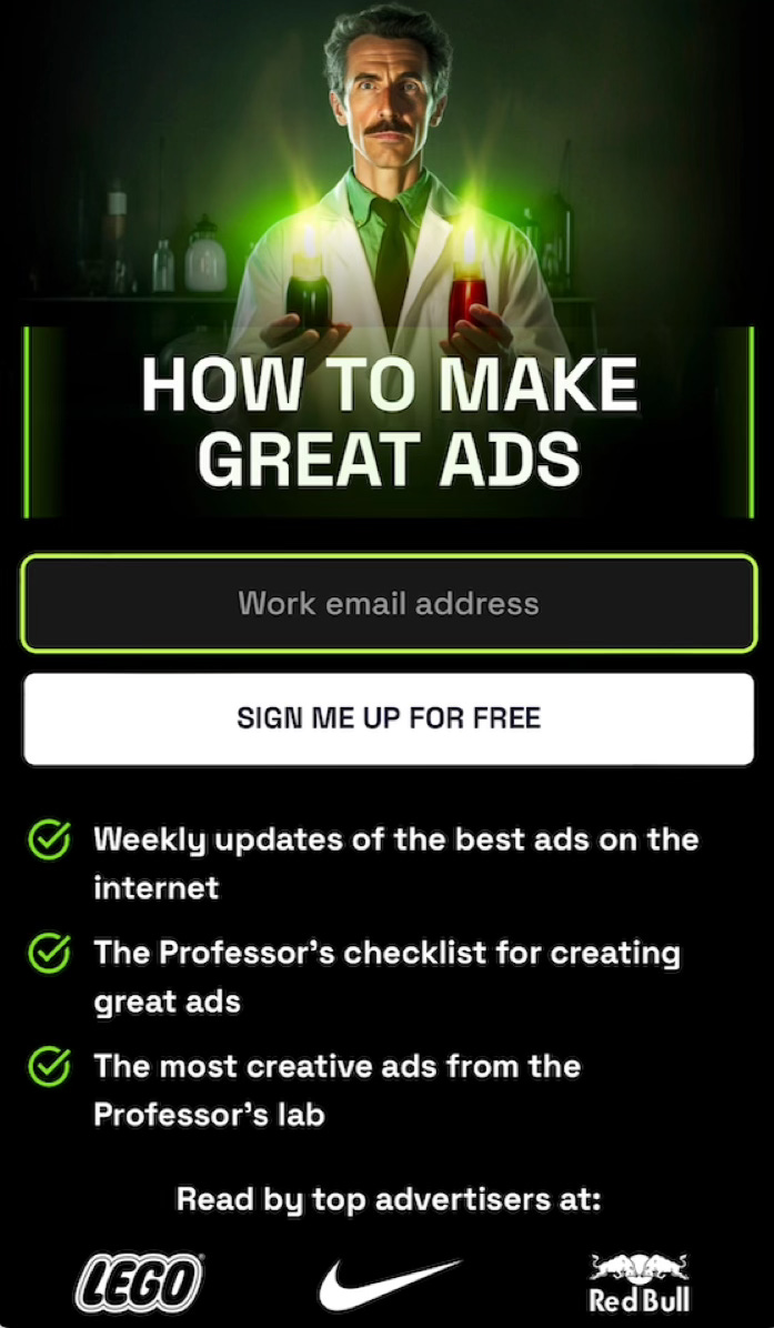 Clear & compelling value prop (with a twist of humor) — “How to Make Great Ads” is straightforward. But the professor persona adds personality without sacrificing clarity.