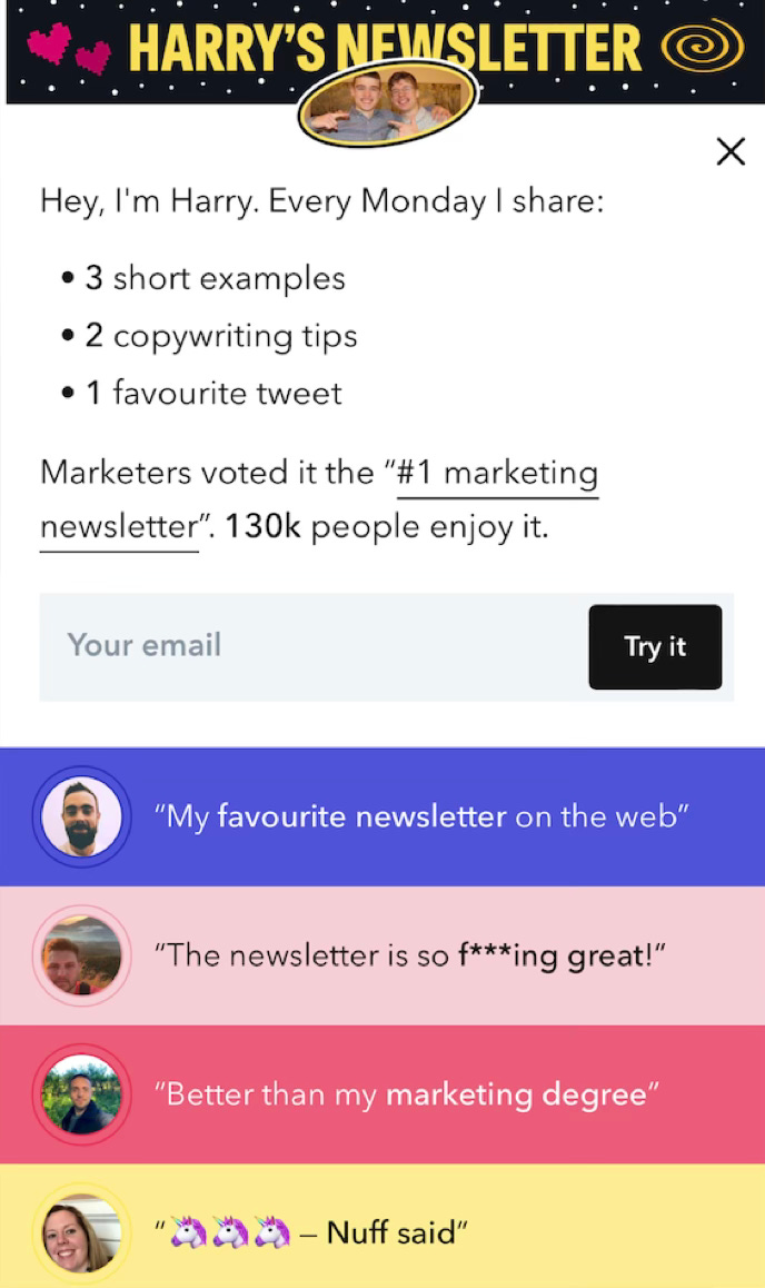 Clear, concise, & tangible value prop - “3 short examples, 2 copywriting tips, 1 favourite tweet.” You know exactly what you’re getting before opting-in.
