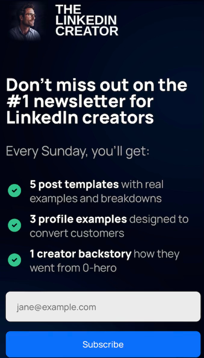 Headline creates FOMO - “Don’t miss out on the #1 newsletter for LinkedIn creators.” Nobody wants to be out of the loop.