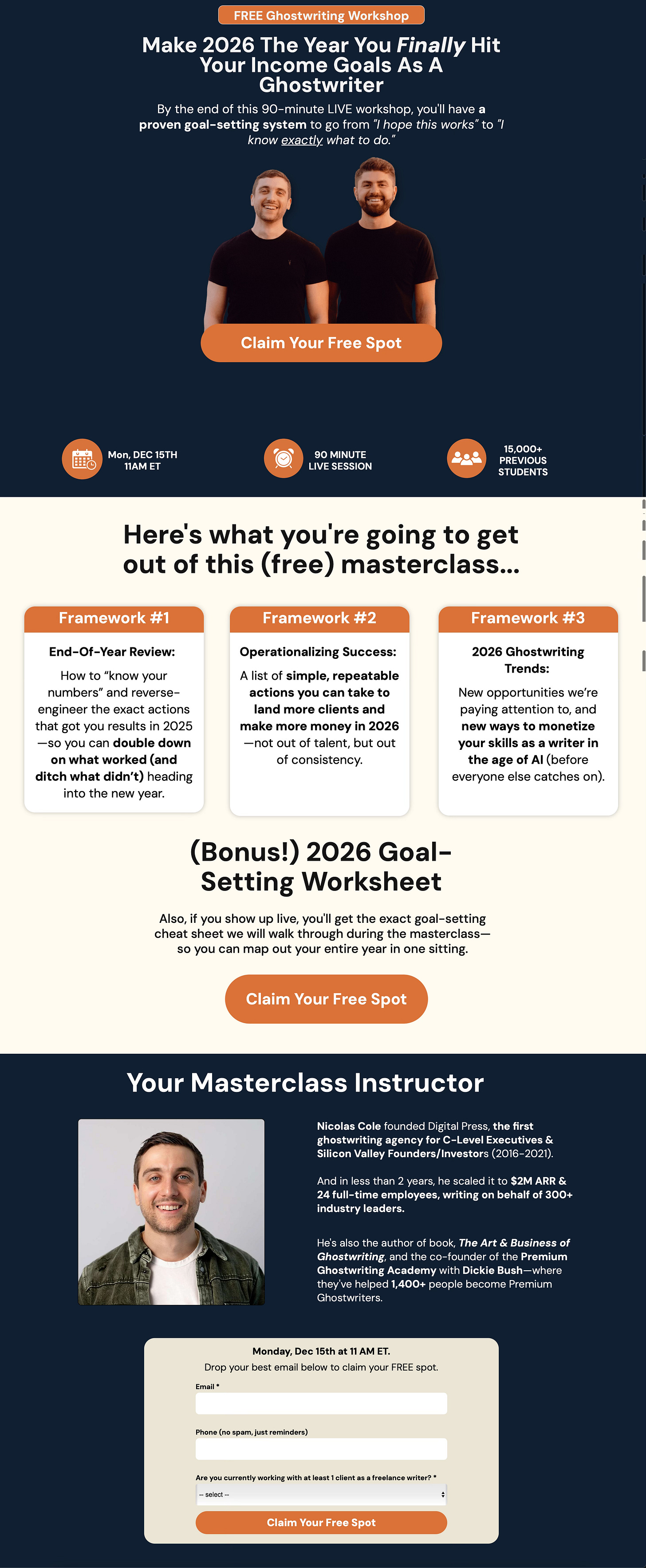 Pre-headline: “FREE Ghostwriting Workshop” — immediately frames the event and removes the price objection