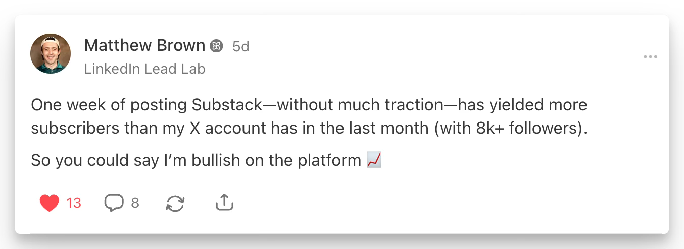 And the nice thing is - if you already have a newsletter on a different platform (like Kit, beehiiv, etc.), you don’t have to migrate in order to tap into Substack’s traffic arbitrage.