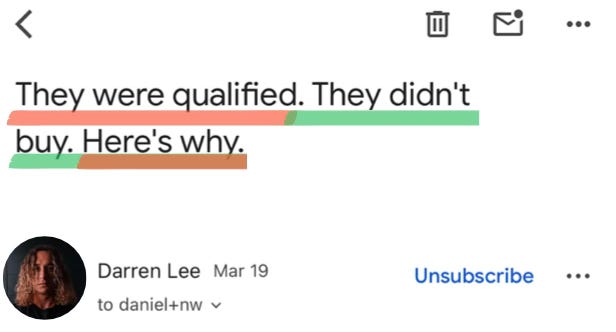 This one grabs attention by speaking to a common pain point (qualified leads not buying). Then it creates curiosity by teasing the real reason - which you have to open to learn.