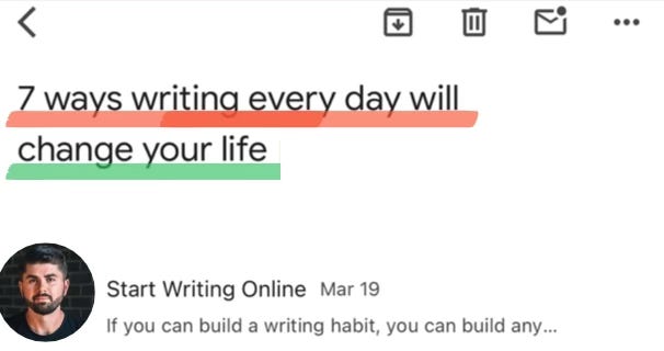 This one grabs attention with a specific number (7). Then it creates curiosity by contrasting a small habit (writing every day) with a massive outcome (change your life).