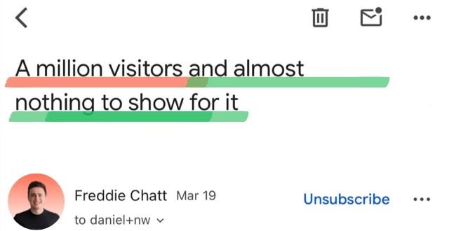 This grabs attention with a big number (a million visitors). Then it flips success into failure - wait, nothing to show for it? How is that possible?