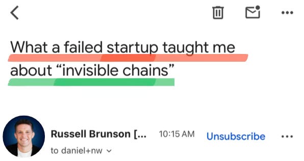 This one grabs attention with a vulnerable statement (”failed startup”). Then it creates curiosity by teasing a surprising insight - what are “invisible chains”?