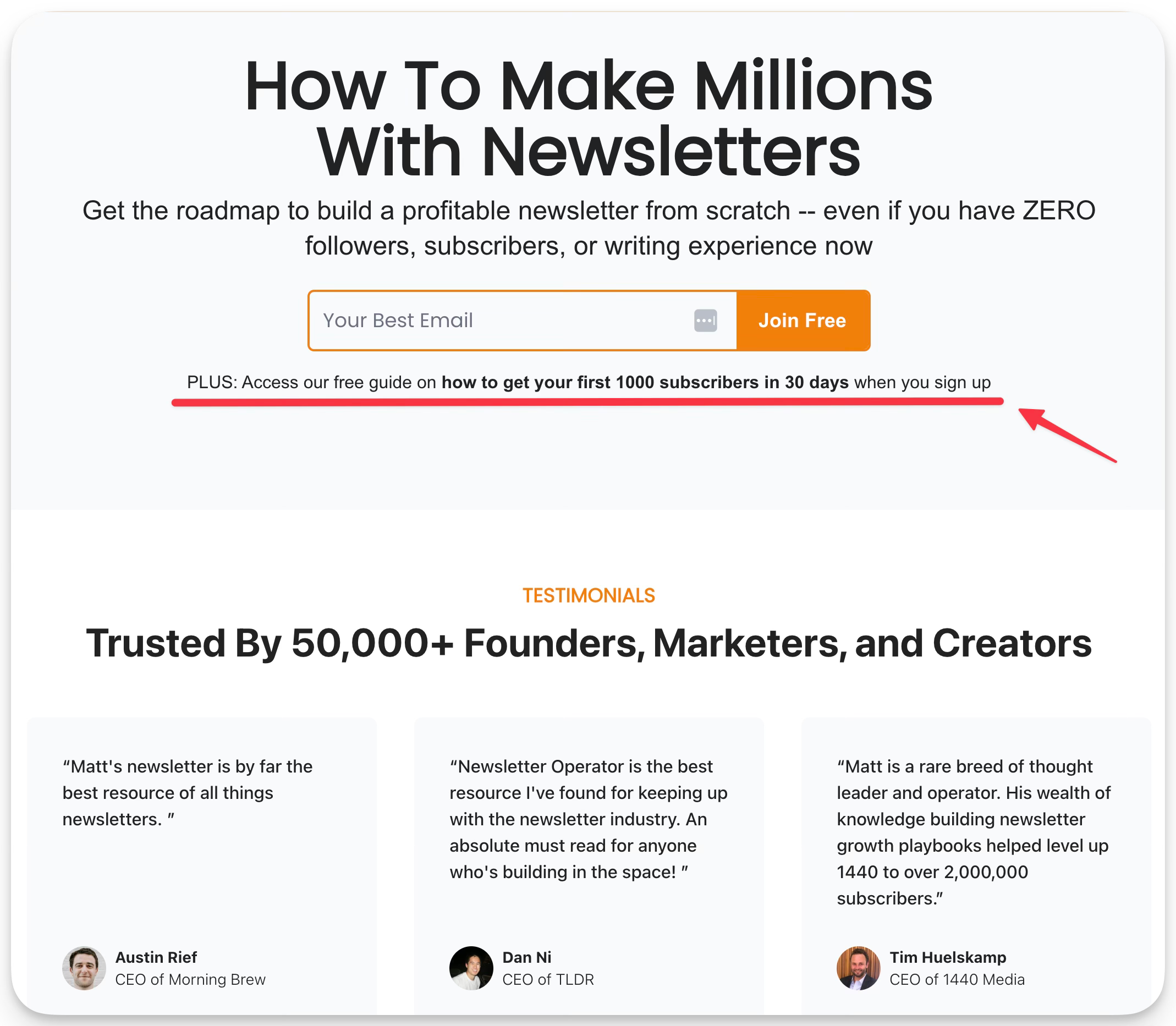 Matt runs a newsletter about building profitable newsletters, and when you sign up, you immediately get his free guide on “how to get your first 1000 subscribers in 30 days.”